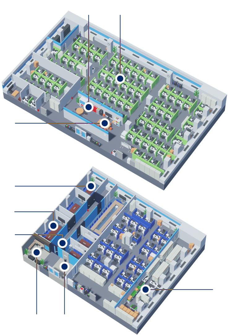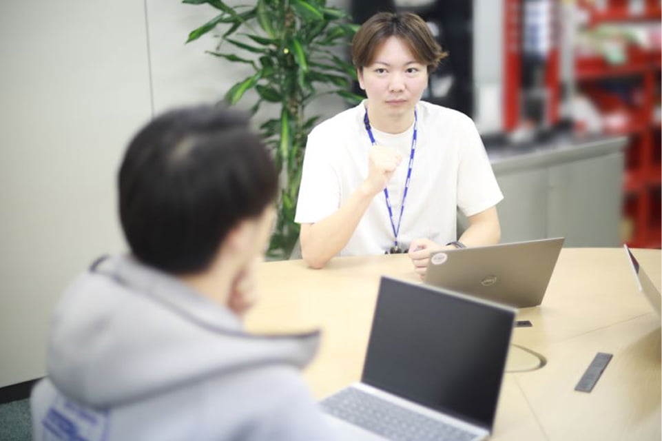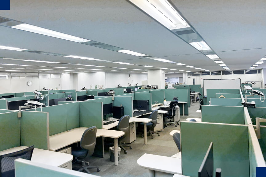 各席が低めのパーテーションで区切られているため、作業に集中できます。 また職種ごとではなく、プロジェクトごとに座席を配置しているため、業務上話すことが多いスタッフ同士が近くに配置されるなどコミュニケーションがとりやすくなっています。