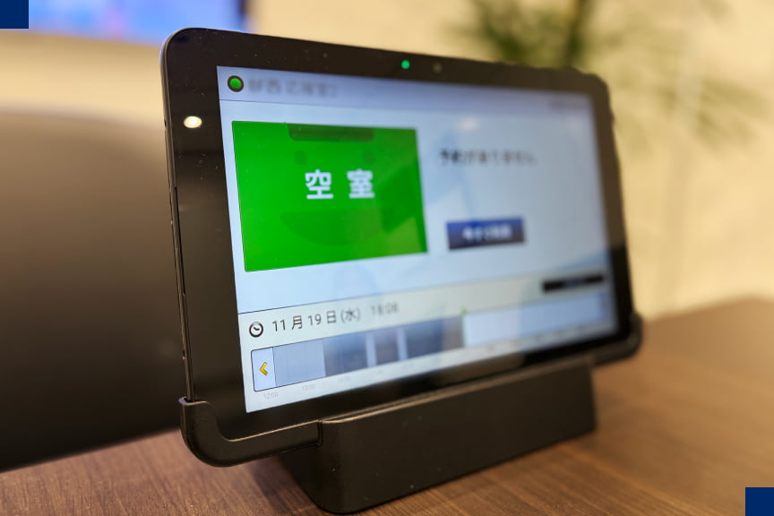 すべての会議室に「会議室予約システム」のタブレットを設置。効率よく会議室が利用できるようになっています。 予約終了時間の5分前と1分前に鳴るアラーム音は、当社サウンド開発部作成のオリジナルです。
