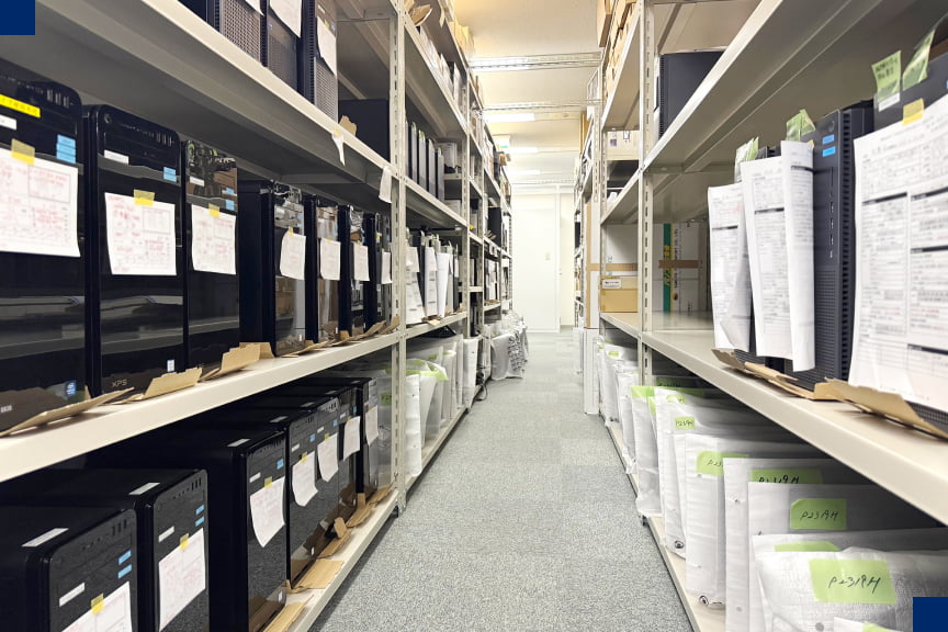 社員が使用するパソコンのキッティングやメンテナンスを行う部屋です。 作業机や、緊急時のストック用パソコンが保管されています。